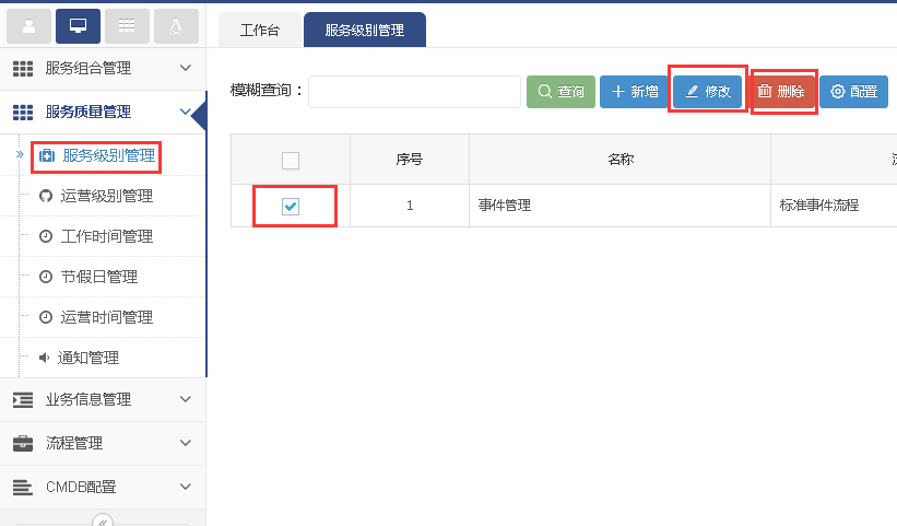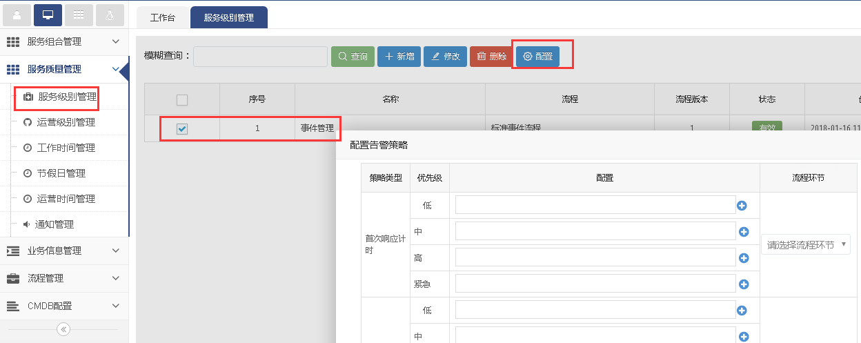 點(diǎn)擊新增。彈出對(duì)話框后,填寫名稱(如事件管理),在 流程的下拉框中選擇流程(如事件流程),可適當(dāng)填寫描述,點(diǎn)擊保存。*頁(yè)面中的yes代表設(shè)置的這個(gè)服務(wù)級(jí)別生效。