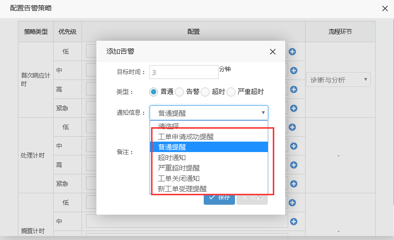 首次響應(yīng)計(jì)時(shí),流程環(huán)節(jié)需要選擇,然后根據(jù)事件的優(yōu)先級(jí)選擇右側(cè)‘+’,進(jìn)行通知信息填寫。