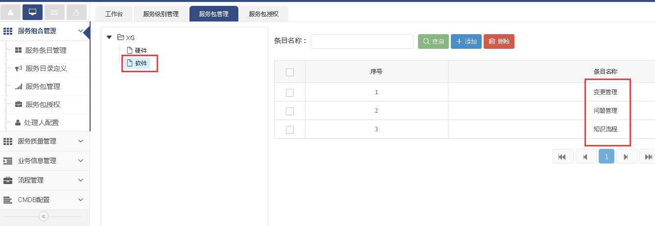 服務包添加服務條目:選擇一個服務包,在右邊列表處點擊添加。彈出對話框之后選擇服務條目,點擊提交(選擇了服務條目之后才可以使用條目里面的流程)