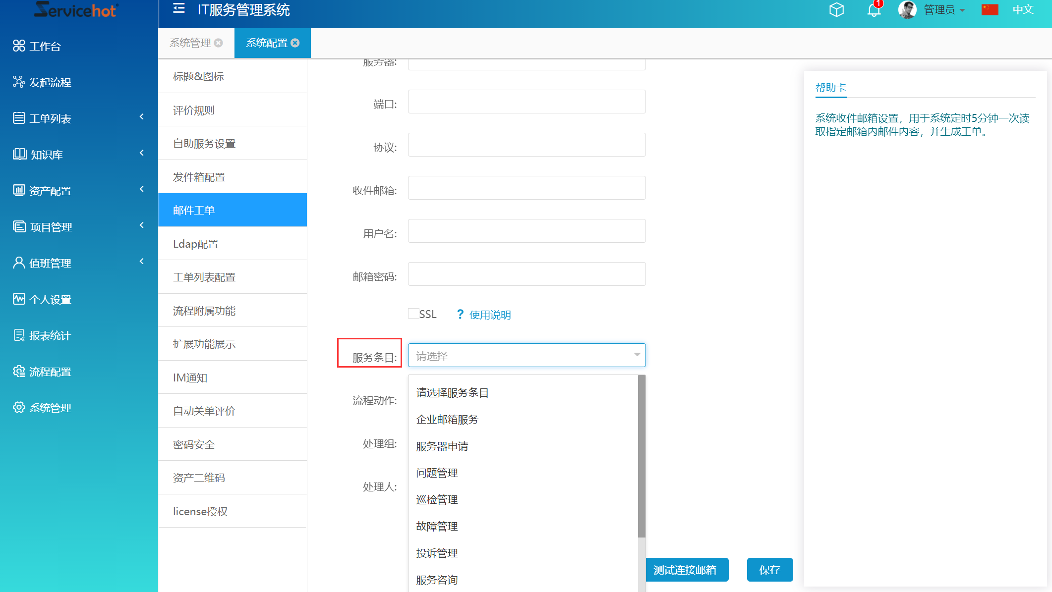 6:郵件渠道配置中新增:可自定義指定郵件轉工單的流程條目。