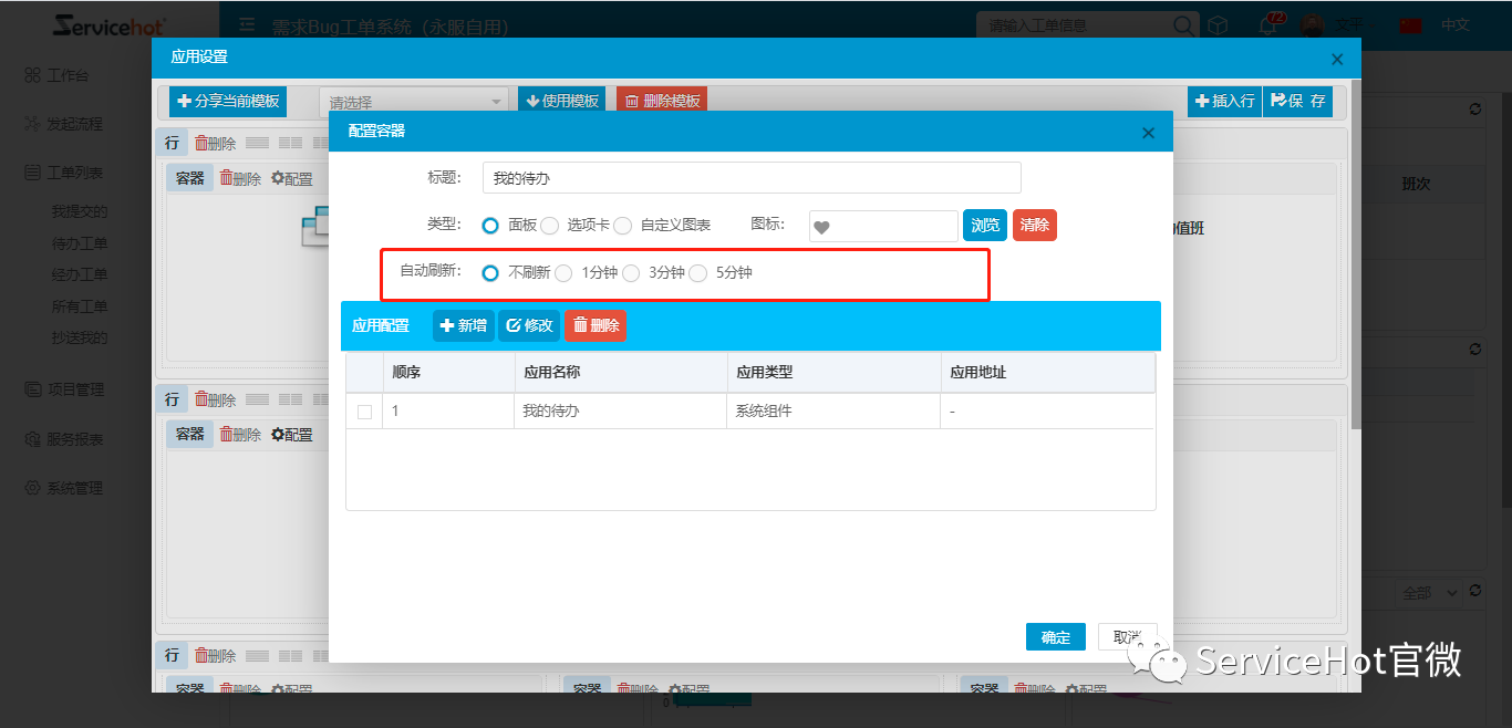 Servicehot產(chǎn)品為不同角色用戶提供個性化的工作臺,允許用戶自由配置自己的工作臺和待辦展示,本次優(yōu)化新增自動刷新功能,讓工作臺展示數(shù)據(jù)更加精準(zhǔn)。