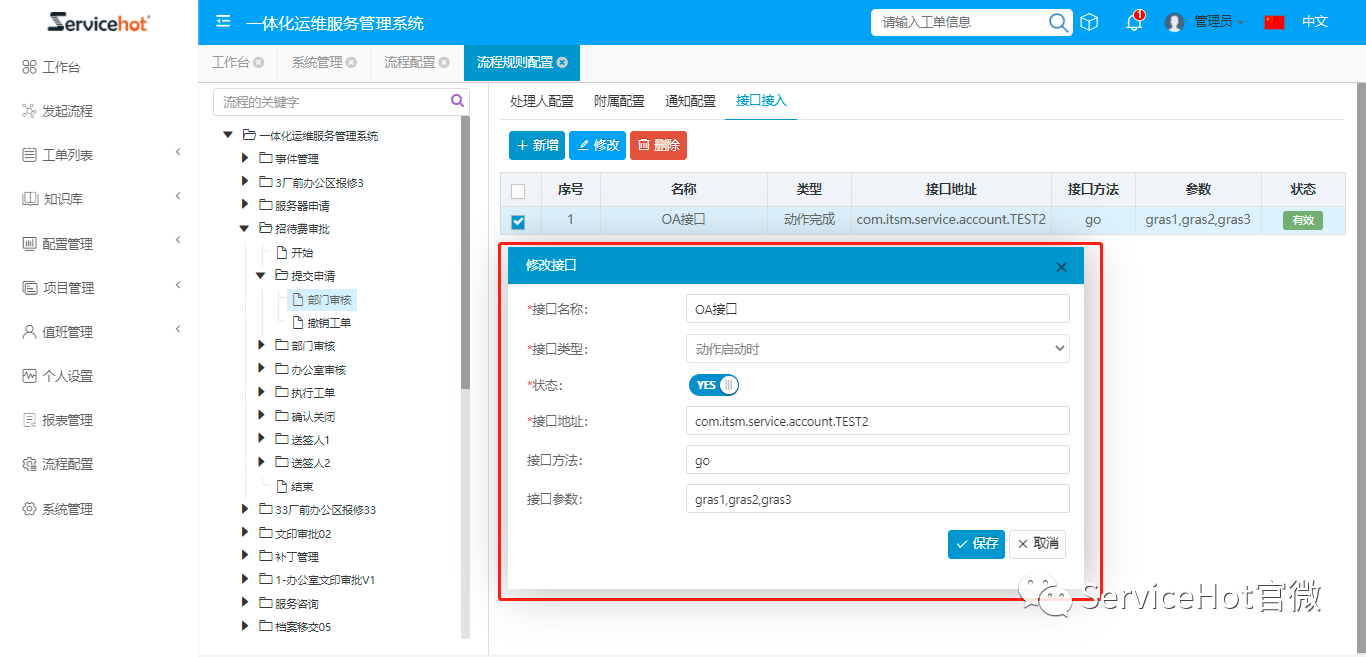 Servicehot產(chǎn)品為用戶提供基于webservice和API的標(biāo)準(zhǔn)接口,為便于管理員設(shè)計(jì)流程和接口,本次優(yōu)化流程配置功能,管理員在配置流程規(guī)則時,可直接配置三方應(yīng)用接口,實(shí)現(xiàn)流程多方聯(lián)動。