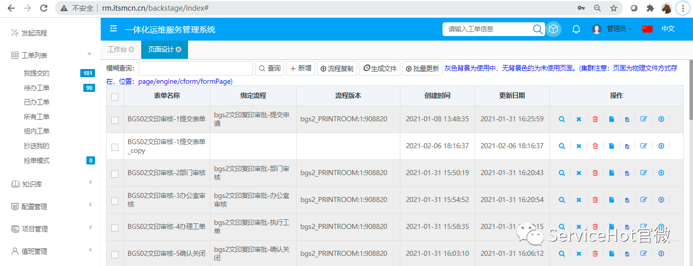 Servicehot產(chǎn)品為用戶提供流程引擎和頁面引擎功能,為便于管理員設(shè)計(jì)頁面時快速找到需要的頁面與流程進(jìn)行綁定,本次優(yōu)化頁面引擎,增加自動判斷綁定功能,已被流程綁定的頁面采用灰底色提醒,未綁定的頁面無底色。