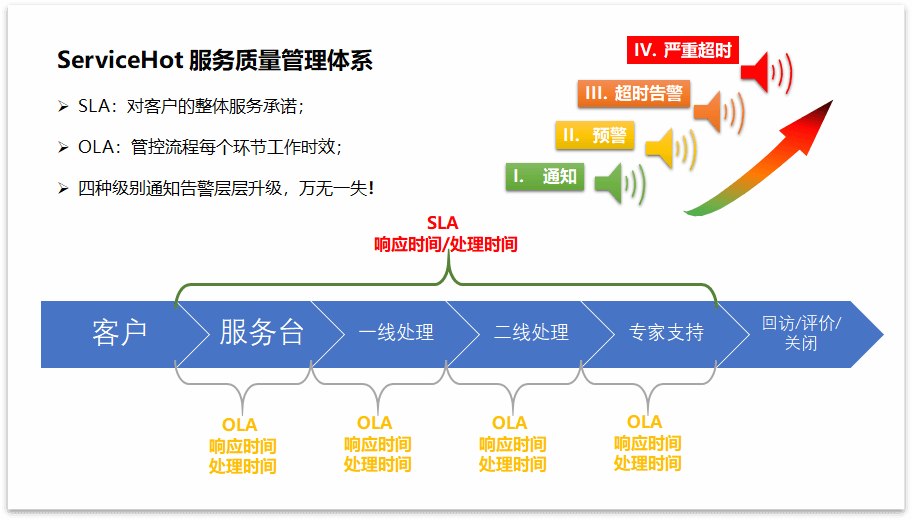 根據SLA服務級別協議和OLA運營級別協議,設置通知告警逐步升級策略,確保事件工單的及時解決;