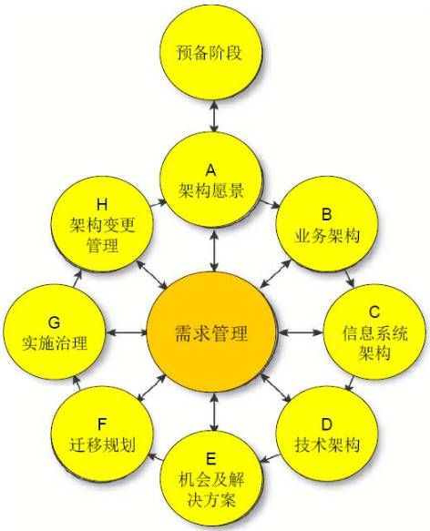 TOGAF是The Open Group Architecture Forum的簡寫,其本質(zhì)是一個行業(yè)標(biāo)準(zhǔn)的體系架構(gòu)框架。比較核心的是這幅圖,TOGAF的架構(gòu)開發(fā)方法ADM。