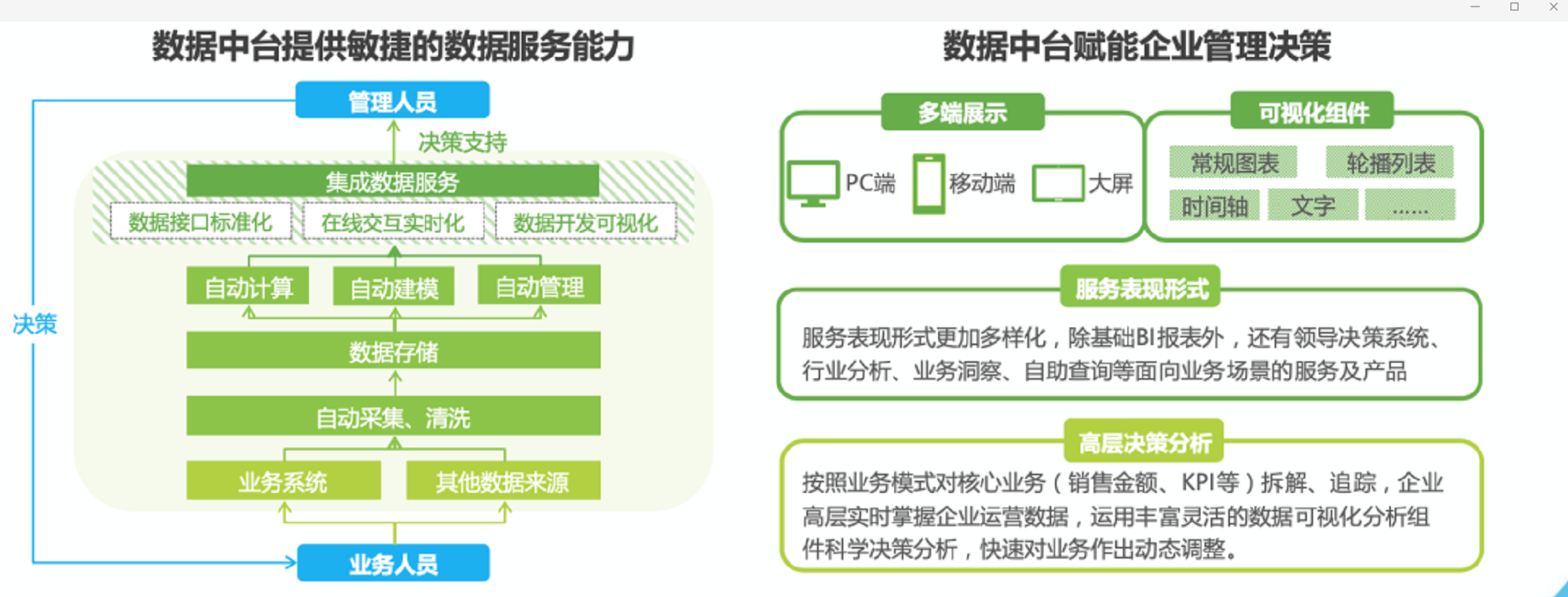 在信息化時代,企業(yè)積累了大量的數(shù)據(jù)。后端的業(yè)務(wù)數(shù)據(jù),本地的會員數(shù)據(jù),零散的銷售數(shù)據(jù)以及各個軟件平臺上的運(yùn)營數(shù)據(jù)。當(dāng)我們在講數(shù)據(jù)即資產(chǎn)時,如果你的數(shù)據(jù)是孤立的,無法串聯(lián),無法合并,無法識別的,那么這數(shù)據(jù)在我看來是無效的信息而已,根本稱不上有價值的數(shù)據(jù)。我們舉個例子。假如您通過頭條,小紅書,抖音以及現(xiàn)行廣告投放積累了一批粉絲轉(zhuǎn)化了產(chǎn)品。那么用戶的基礎(chǔ)信息,消費(fèi)信息,日常興趣標(biāo)簽信息,地域信息等,都散落在不同的平臺上。這些數(shù)據(jù)我稱之為:”平臺粉絲“而不是品牌粉絲。這些粉絲的忠誠度是在平臺,而不是品牌。因為他們通過平臺的視頻和內(nèi)容轉(zhuǎn)化了成交。用戶記住的是,抖音上買的東西質(zhì)量還不錯,頭條上有一門課程了等。做為企業(yè)品牌方,需要獲取用戶的檔案,會員標(biāo)簽和畫像,一定需要獲取全面完整的,有價值的數(shù)據(jù),希望通過平臺上的大流量將用戶轉(zhuǎn)化到本人的品牌私域流量池內(nèi)。如果所有的數(shù)據(jù)不通,則為數(shù)字化升級的第一絆腳石。只有數(shù)據(jù)全部打通,可識別,可流轉(zhuǎn),數(shù)據(jù)才有價值。數(shù)據(jù)中臺不是簡單的一套軟件系統(tǒng)或者標(biāo)準(zhǔn)化產(chǎn)品,更多的是一種強(qiáng)調(diào)資源整合、 集中配置、能力沉淀、分步執(zhí)行的運(yùn)作機(jī)制,是一系列數(shù)據(jù)組件或模塊的集合,為 企業(yè)數(shù)據(jù)治理效率的提升、業(yè)務(wù)流程與組織架構(gòu)的升級、運(yùn)營與決策的精細(xì)化賦能。多數(shù)企業(yè)在過去的信息化建設(shè)過程中,有一些遺留的數(shù)據(jù)問題待解決:1、數(shù)據(jù)來源和定義不一致,導(dǎo)致同一個用戶的信息在不同的系統(tǒng)內(nèi)可能標(biāo)示不同,導(dǎo)致不同系統(tǒng)的打通花費(fèi)了大量的時間在數(shù)據(jù)清洗上;2、不同信息系統(tǒng)的數(shù)據(jù)為了保證及時,準(zhǔn)確性以及完整性,需要進(jìn)行多系統(tǒng)打通,打通有技術(shù)門檻;3、各個部門對數(shù)據(jù)共享意愿度導(dǎo)致數(shù)據(jù)共享推動過程中會產(chǎn)生阻力;搭建數(shù)據(jù)中臺,可以打破數(shù)據(jù)孤島問題,釋放數(shù)據(jù)價值。